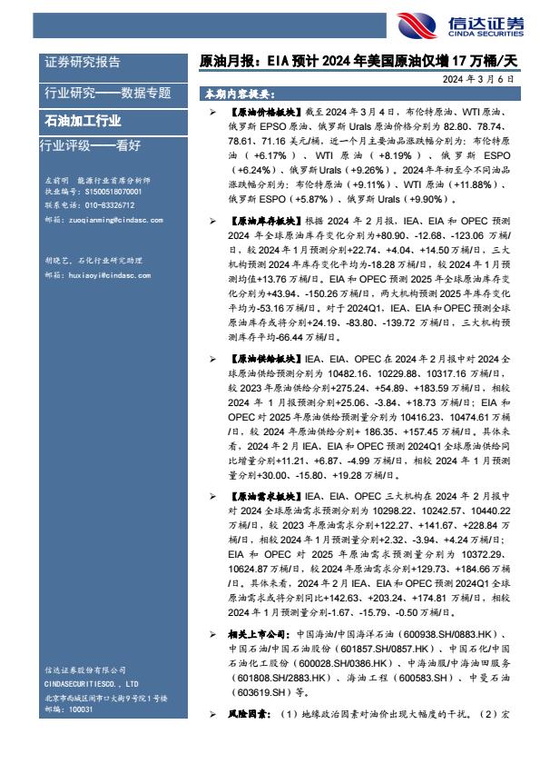 【5715B】石油加工行业原油月报:EIA预计2024年美国原油仅增17万桶/天240306信达证券27页 2024-03-16 3月 106 预览结束,一共25页,请下载后查看 资源下载下载价格59 H币VIP免费升级VIP立即购买下载或充值问题请将订单号发送到:2907878669@qq.com ,我们会在24小时内为您处理 能源化工
