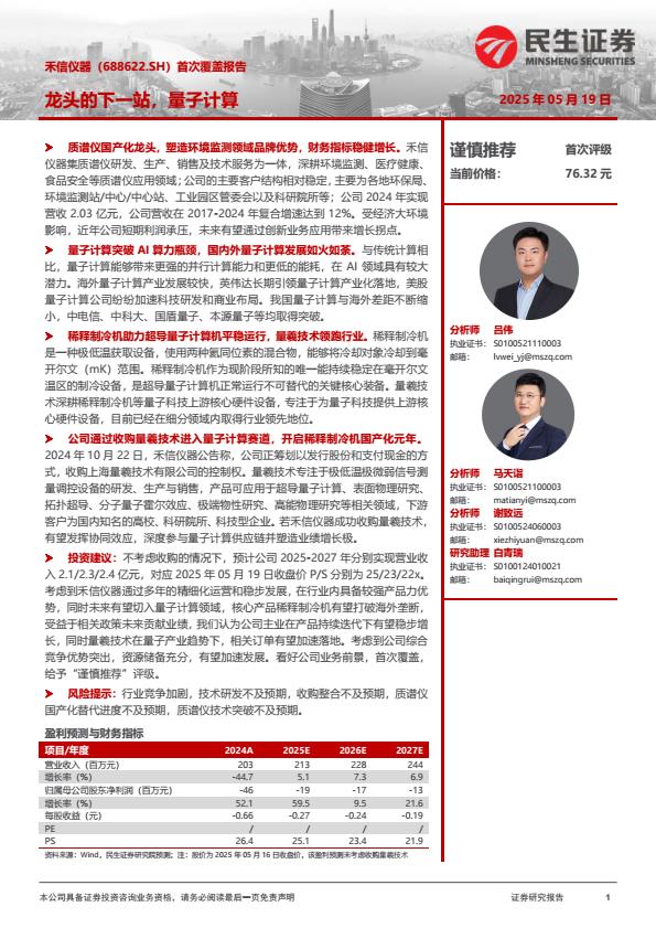【14281E】禾信仪器(688622)首次覆盖报告:龙头的下一站,量子计算250519民生证券33页 2025-05-30 5月 20 预览结束,本文件为PDF文档,一共33页,请购买后,下载查看 资源下载下载价格59 H币VIP免费升级VIP立即购买下载或充值问题请将订单号发送到:2907878669@qq.com ,我们会在24小时内为您处理 金融分析