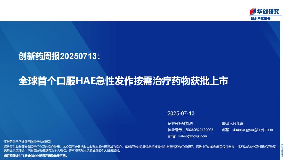 【18640】【华创证券】创新药周报:全球首个口服HAE急性发作按需治疗药物获批上市 20小时前 7月 1 预览结束,本文件为PDF文档,一共22页,请购买后,下载查看 资源下载下载价格59 H币VIP免费升级VIP立即购买下载或充值问题请将订单号发送到:2907878669@qq.com ,我们会在24小时内为您处理 医疗保健