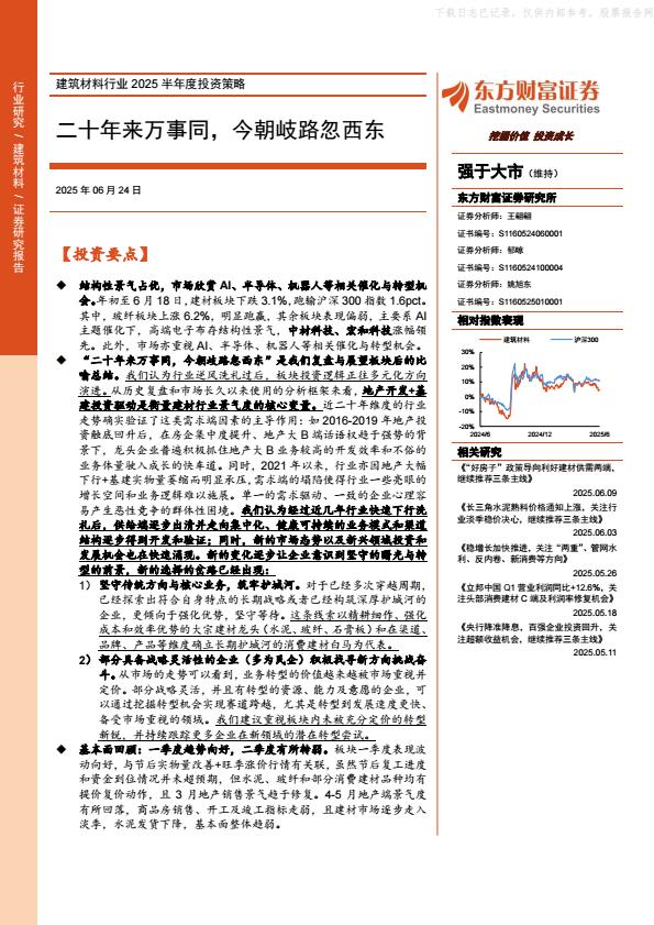 【18871】【东方财富证券】建筑材料行业2025半年度投资策略:二十年来万事同,今朝岐路忽西东 13小时前 7月 1 预览结束,本文件为PDF文档,一共28页,请购买后,下载查看 资源下载下载价格59 H币VIP免费升级VIP立即购买下载或充值问题请将订单号发送到:2907878669@qq.com ,我们会在24小时内为您处理 地产开发