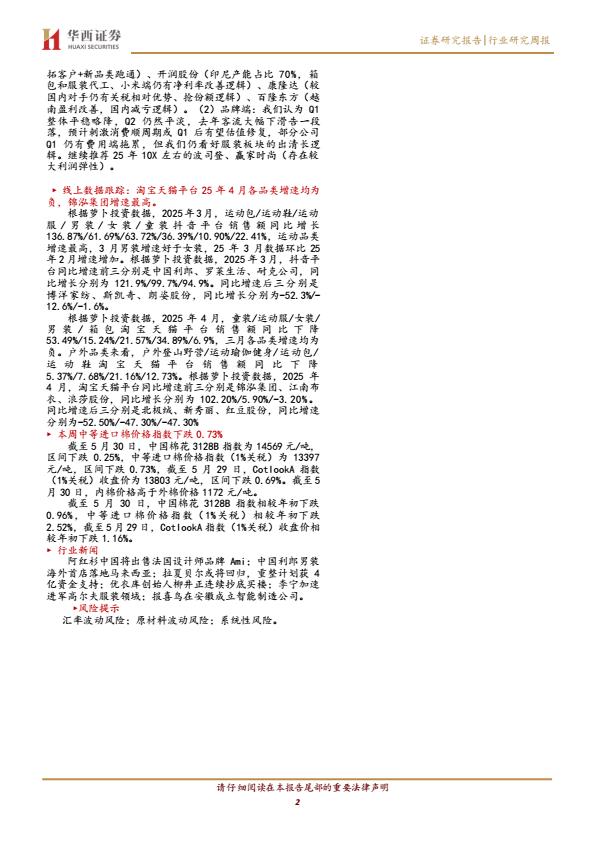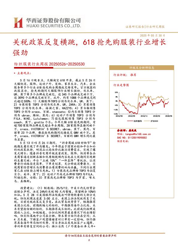 【18568】【华西证券】纺织服装行业周报:关税政策反复横跳,618抢先购服装行业增长强劲 20小时前 7月 2 预览结束,本文件为PDF文档,一共38页,请购买后,下载查看 资源下载下载价格59 H币VIP免费升级VIP立即购买下载或充值问题请将订单号发送到:2907878669@qq.com ,我们会在24小时内为您处理 消费零售
