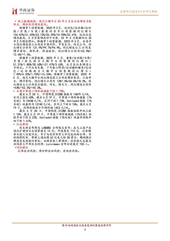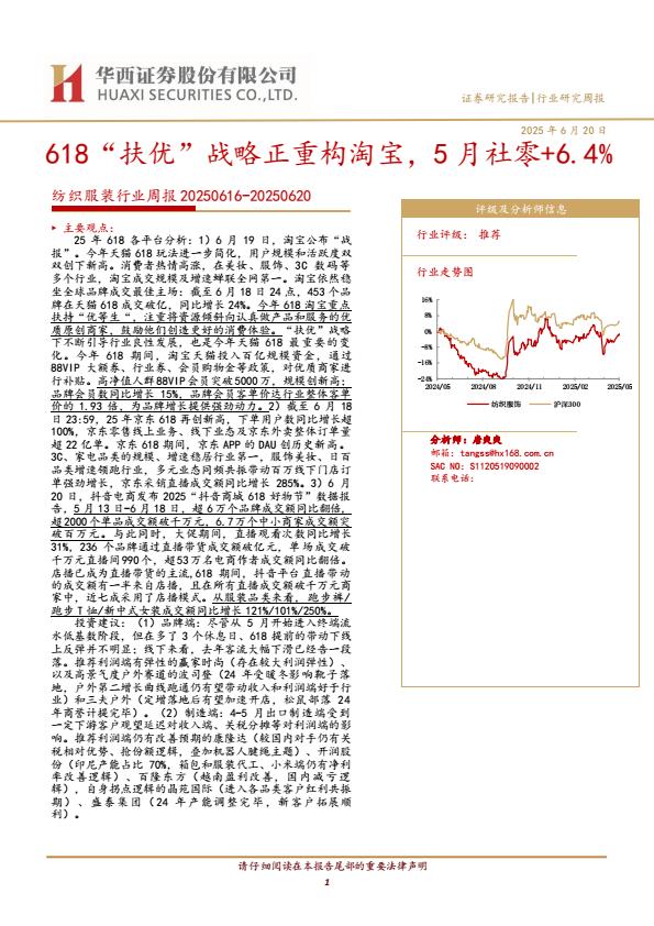 【18569】【华西证券】纺织服装行业周报:618“扶优”战略正重构淘宝,5月社零+6.4% 20小时前 7月 1 预览结束,本文件为PDF文档,一共39页,请购买后,下载查看 资源下载下载价格59 H币VIP免费升级VIP立即购买下载或充值问题请将订单号发送到:2907878669@qq.com ,我们会在24小时内为您处理 消费零售