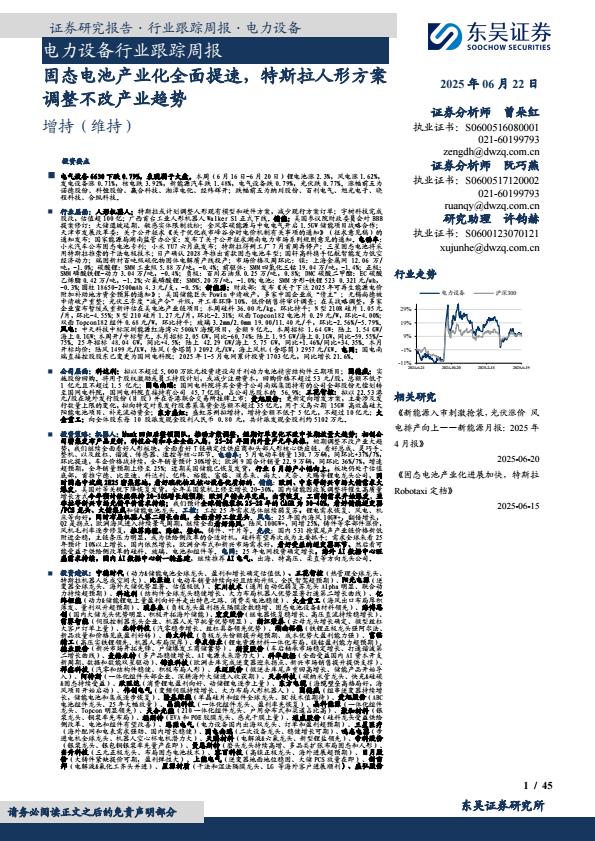 【18854】【东吴证券】电力设备行业跟踪周报:固态电池产业化全面提速,特斯拉人形方案调整不改产业趋势 20小时前 7月 2 预览结束,本文件为PDF文档,一共45页,请购买后,下载查看 资源下载下载价格59 H币VIP免费升级VIP立即购买下载或充值问题请将订单号发送到:2907878669@qq.com ,我们会在24小时内为您处理 能源化工