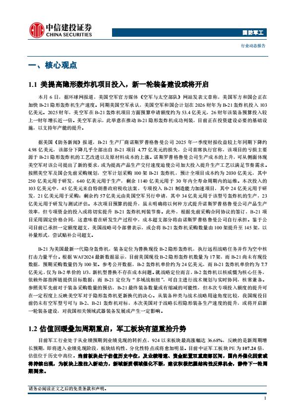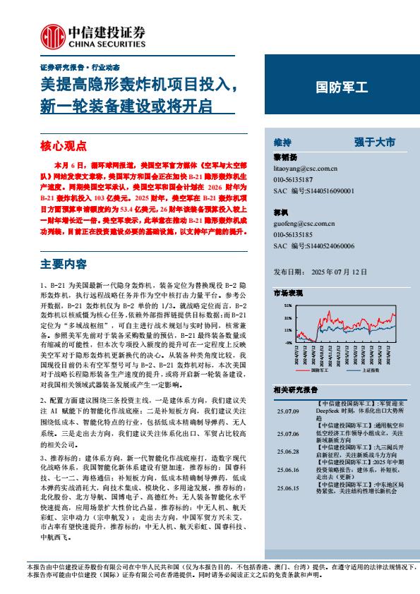 【18301】【中信建投】国防军工行业动态:美提高隐形轰炸机项目投入,新一轮装备建设或将开启 17小时前 7月 1 预览结束,本文件为PDF文档,一共22页,请购买后,下载查看 资源下载下载价格59 H币VIP免费升级VIP立即购买下载或充值问题请将订单号发送到:2907878669@qq.com ,我们会在24小时内为您处理 军工