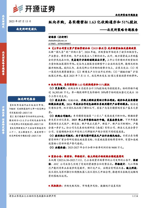 【18538】【开源证券】北交所策略专题报告:纵向并购,易实精密拟1.63亿收购通亦和51%股权 20小时前 7月 1 预览结束,本文件为PDF文档,一共14页,请购买后,下载查看 资源下载下载价格59 H币VIP免费升级VIP立即购买下载或充值问题请将订单号发送到:2907878669@qq.com ,我们会在24小时内为您处理 金融分析
