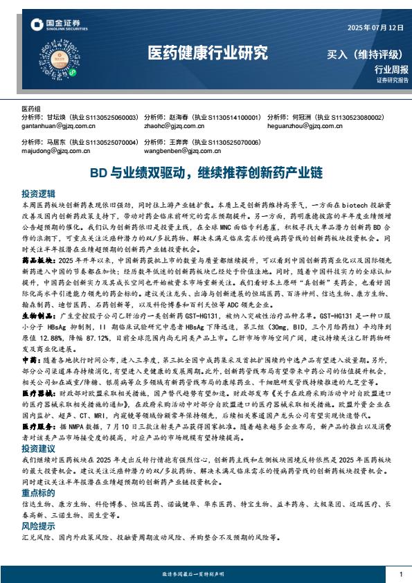 【18739】【国金证券】医药健康行业研究:BD与业绩双驱动,继续推荐创新药产业链 22小时前 7月 2 预览结束,本文件为PDF文档,一共17页,请购买后,下载查看 资源下载下载价格59 H币VIP免费升级VIP立即购买下载或充值问题请将订单号发送到:2907878669@qq.com ,我们会在24小时内为您处理 医疗保健