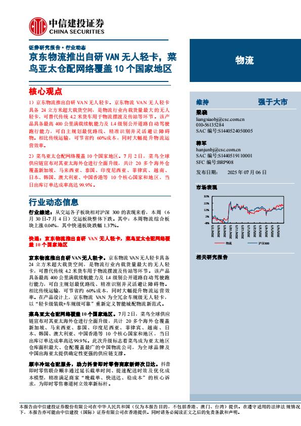 【18239】【中信建投】物流行业:京东物流推出自研VAN无人轻卡,菜鸟亚太仓配网络覆盖10个国家地区 22小时前 7月 1 预览结束,本文件为PDF文档,一共16页,请购买后,下载查看 资源下载下载价格59 H币VIP免费升级VIP立即购买下载或充值问题请将订单号发送到:2907878669@qq.com ,我们会在24小时内为您处理 汽车物流