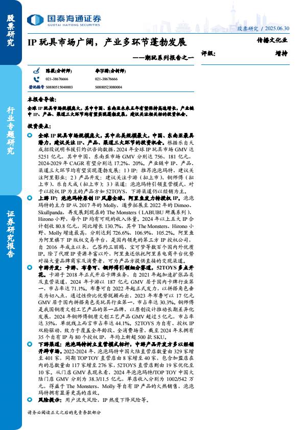 【18709】【国泰海通证券】传播文化行业潮玩系列报告之一:IP玩具市场广阔,产业多环节蓬勃发展 20小时前 7月 1 预览结束,本文件为PDF文档,一共22页,请购买后,下载查看 资源下载下载价格59 H币VIP免费升级VIP立即购买下载或充值问题请将订单号发送到:2907878669@qq.com ,我们会在24小时内为您处理 消费零售