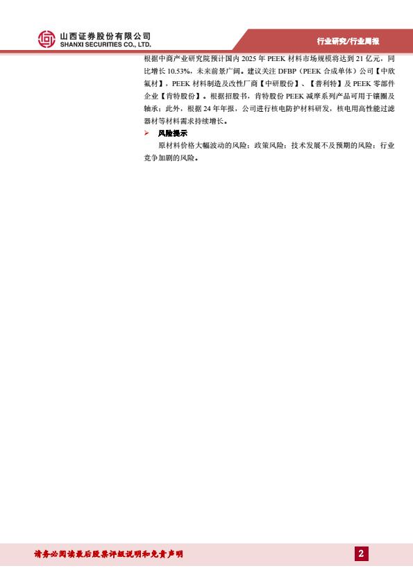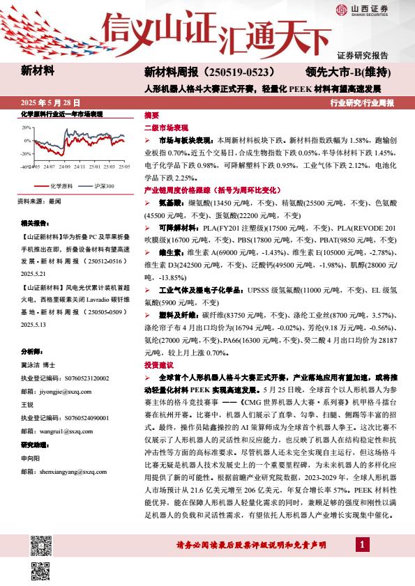 【18481】【山西证券】新材料周报:人形机器人格斗大赛正式开赛,轻量化PEEK材料有望高速发展 22小时前 7月 1 预览结束,本文件为PDF文档,一共23页,请购买后,下载查看 资源下载下载价格59 H币VIP免费升级VIP立即购买下载或充值问题请将订单号发送到:2907878669@qq.com ,我们会在24小时内为您处理 科技电子