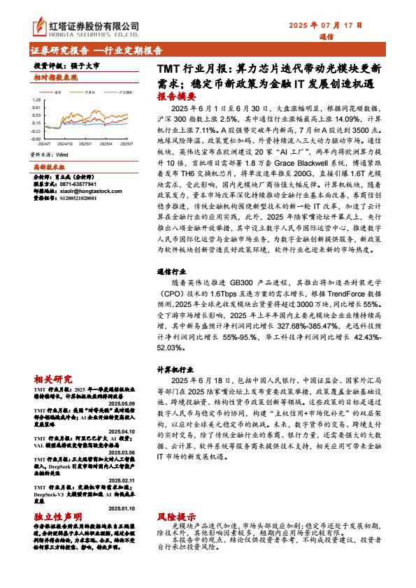 【18200】TMT行业月报:算力芯片迭代带动光模块更新需求;稳定币新政策为金融IT发展创造机遇 1天前 7月 2 预览结束,本文件为PDF文档,一共11页,请购买后,下载查看 资源下载下载价格59 H币VIP免费升级VIP立即购买下载或充值问题请将订单号发送到:2907878669@qq.com ,我们会在24小时内为您处理 科技电子