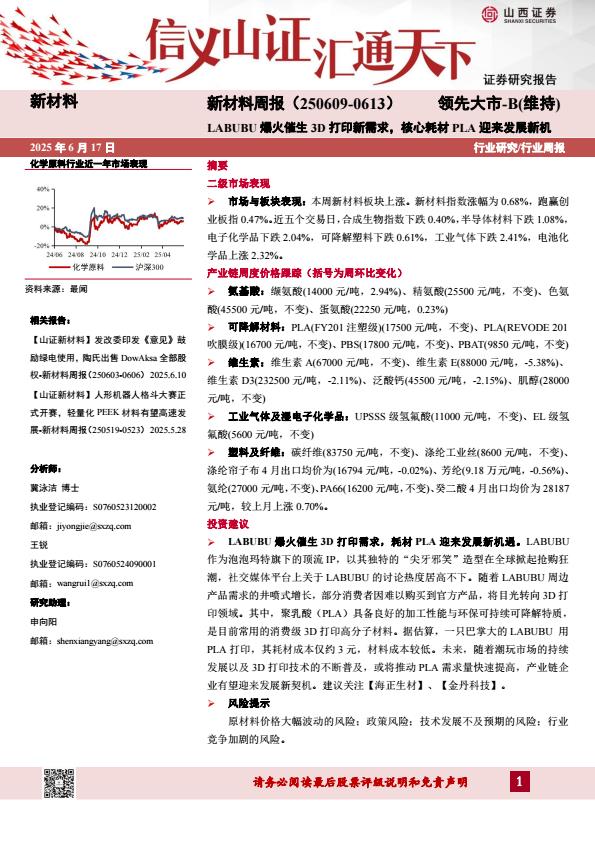 【18485】【山西证券】新材料行业周报:LABUBU爆火催生3D打印新需求,核心耗材PLA迎来发展新机 1天前 7月 1 预览结束,本文件为PDF文档,一共22页,请购买后,下载查看 资源下载下载价格59 H币VIP免费升级VIP立即购买下载或充值问题请将订单号发送到:2907878669@qq.com ,我们会在24小时内为您处理 科技电子
