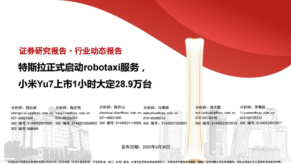 【18263】【中信建投】汽车行业动态报告:特斯拉正式启动robotaxi服务,小米Yu7上市1小时大定28.9万台 1天前 7月 1 预览结束,本文件为PDF文档,一共31页,请购买后,下载查看 资源下载下载价格59 H币VIP免费升级VIP立即购买下载或充值问题请将订单号发送到:2907878669@qq.com ,我们会在24小时内为您处理 汽车物流