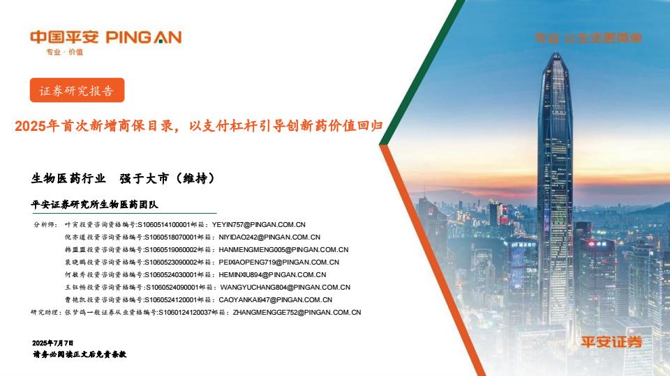 【18494】【平安证券】生物医药行业:2025年首次新增商保目录,以支付杠杆引导创新药价值回归 19小时前 7月 2 预览结束,本文件为PDF文档,一共11页,请购买后,下载查看 资源下载下载价格59 H币VIP免费升级VIP立即购买下载或充值问题请将订单号发送到:2907878669@qq.com ,我们会在24小时内为您处理 科技电子