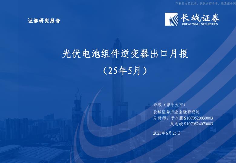 【18409】【长城证券】电力设备及新能源行业:光伏电池组件逆变器出口月报(25年5月) 2天前 7月 3 预览结束,本文件为PDF文档,一共17页,请购买后,下载查看 资源下载下载价格59 H币VIP免费升级VIP立即购买下载或充值问题请将订单号发送到:2907878669@qq.com ,我们会在24小时内为您处理 能源化工