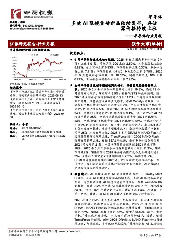 【18210】【中原证券】半导体行业月报:多款AI眼镜重磅新品陆续发布,存储器价格持续上涨 1天前 7月 2 预览结束,本文件为PDF文档,一共47页,请购买后,下载查看 资源下载下载价格59 H币VIP免费升级VIP立即购买下载或充值问题请将订单号发送到:2907878669@qq.com ,我们会在24小时内为您处理 科技电子