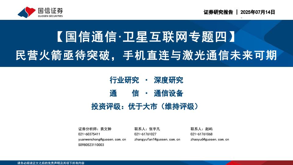 【18675】【国信证券】国信通信卫星互联网专题四:民营火箭亟待突破,手机直连与激光通信未来可期 20小时前 7月 1 预览结束,本文件为PDF文档,一共62页,请购买后,下载查看 资源下载下载价格59 H币VIP免费升级VIP立即购买下载或充值问题请将订单号发送到:2907878669@qq.com ,我们会在24小时内为您处理 科技电子
