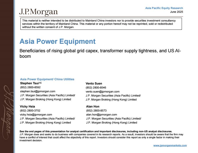 【18504】【摩根大通证券】亚洲电力设备:全球电网资本支出上升、变压器供应紧张及美国人工智能热潮的受益者 2天前 7月 2 预览结束,本文件为PDF文档,一共51页,请购买后,下载查看 资源下载下载价格59 H币VIP免费升级VIP立即购买下载或充值问题请将订单号发送到:2907878669@qq.com ,我们会在24小时内为您处理 科技电子