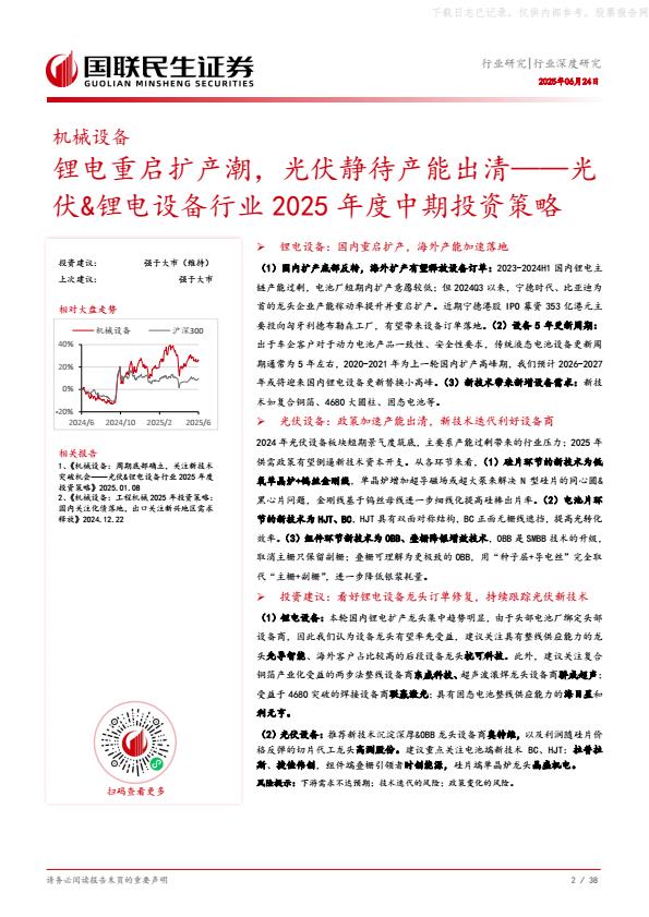 【18735】【国联民生证券】光伏&锂电设备行业2025年度中期投资策略:锂电重启扩产潮,光伏静待产能出清 1天前 7月 2 预览结束,本文件为PDF文档,一共39页,请购买后,下载查看 资源下载下载价格59 H币VIP免费升级VIP立即购买下载或充值问题请将订单号发送到:2907878669@qq.com ,我们会在24小时内为您处理 能源化工