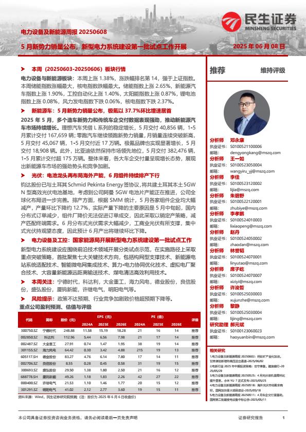 【18515】【民生证券】电力设备及新能源周报:5月新势力销量公布,新型电力系统建设第一批试点工作开展 2天前 7月 3 预览结束,本文件为PDF文档,一共23页,请购买后,下载查看 资源下载下载价格59 H币VIP免费升级VIP立即购买下载或充值问题请将订单号发送到:2907878669@qq.com ,我们会在24小时内为您处理 科技电子