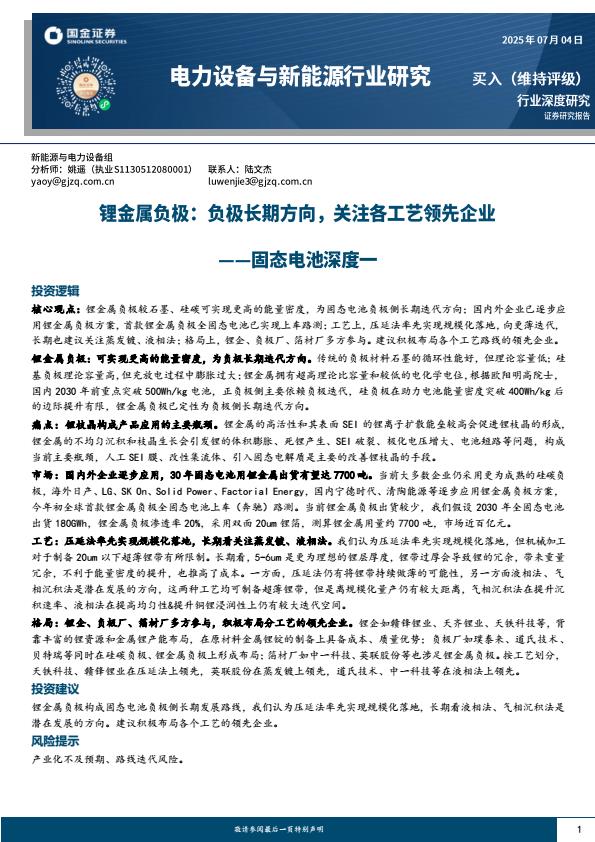 【18763】【国金证券】电力设备与新能源行业固态电池深度一:锂金属负极,负极长期方向,关注各工艺领先企业 2天前 7月 1 预览结束,本文件为PDF文档,一共22页,请购买后,下载查看 资源下载下载价格59 H币VIP免费升级VIP立即购买下载或充值问题请将订单号发送到:2907878669@qq.com ,我们会在24小时内为您处理 能源化工