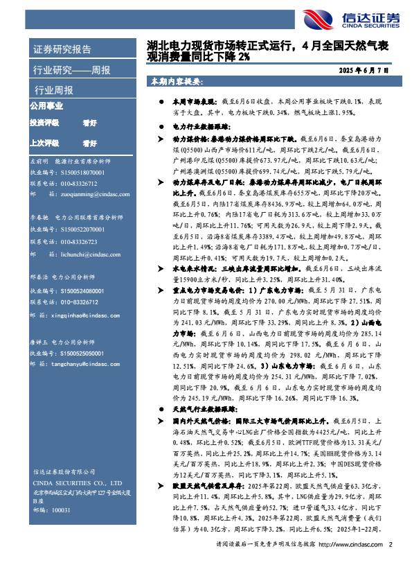 【18422】【信达证券】公用事业—电力天然气周报:湖北电力现货市场转正式运行,4月全国天然气表观消费量同比下降2% 2天前 7月 1 预览结束,本文件为PDF文档,一共21页,请购买后,下载查看 资源下载下载价格59 H币VIP免费升级VIP立即购买下载或充值问题请将订单号发送到:2907878669@qq.com ,我们会在24小时内为您处理 能源化工