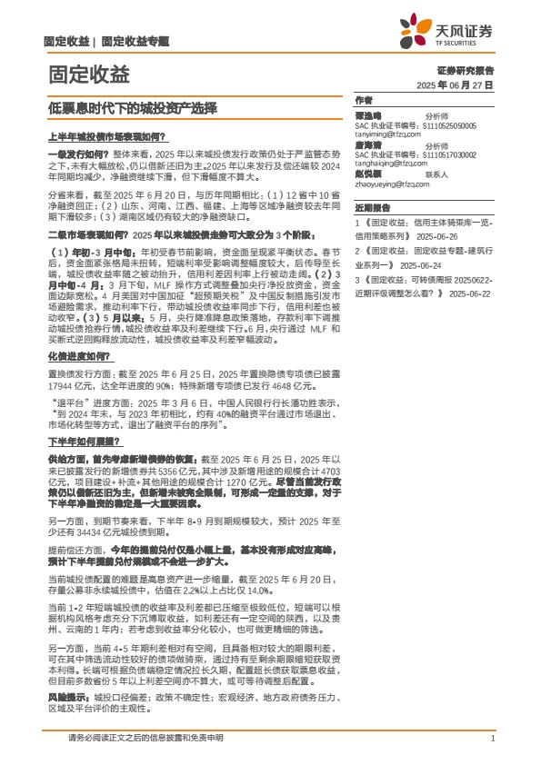 【18453】【天风证券】固定收益专题:低票息时代下的城投资产选择 20小时前 7月 1 预览结束,本文件为PDF文档,一共20页,请购买后,下载查看 资源下载下载价格59 H币VIP免费升级VIP立即购买下载或充值问题请将订单号发送到:2907878669@qq.com ,我们会在24小时内为您处理 银行金融