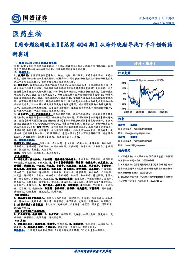 【18714】【国盛证券】医药生物行业周报:【周专题&周观点】【总第404期】从海外映射寻找下半年创新药新赛道 1天前 7月 1 预览结束,本文件为PDF文档,一共29页,请购买后,下载查看 资源下载下载价格59 H币VIP免费升级VIP立即购买下载或充值问题请将订单号发送到:2907878669@qq.com ,我们会在24小时内为您处理 科技电子