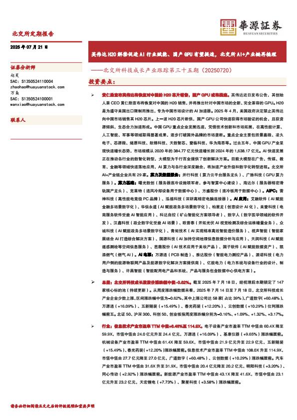 【18552】【华源证券】北交所科技成长产业跟踪第三十五期:英伟达H20解禁促进AI行业赋能、国产GPU有望提速,北交所AI%2b产业链再梳理 16小时前 7月 1 预览结束,本文件为PDF文档,一共22页,请购买后,下载查看 资源下载下载价格59 H币VIP免费升级VIP立即购买下载或充值问题请将订单号发送到:2907878669@qq.com ,我们会在24小时内为您处理 科技电子