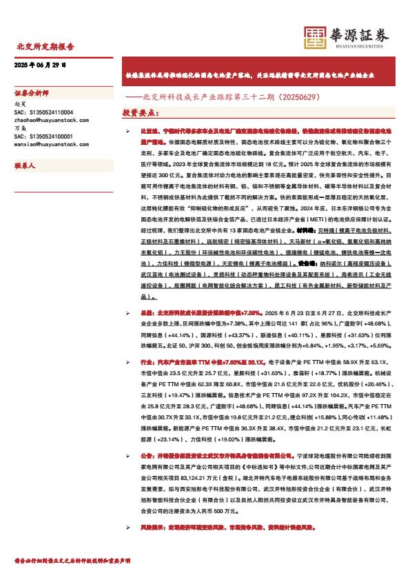 【18553】【华源证券】北交所科技成长产业跟踪第三十二期:铁镍集流体或将推动硫化物固态电池量产落地,关注远航精密等北交所固态电池产业链企业 1天前 7月 1 预览结束,本文件为PDF文档,一共20页,请购买后,下载查看 资源下载下载价格59 H币VIP免费升级VIP立即购买下载或充值问题请将订单号发送到:2907878669@qq.com ,我们会在24小时内为您处理 科技电子