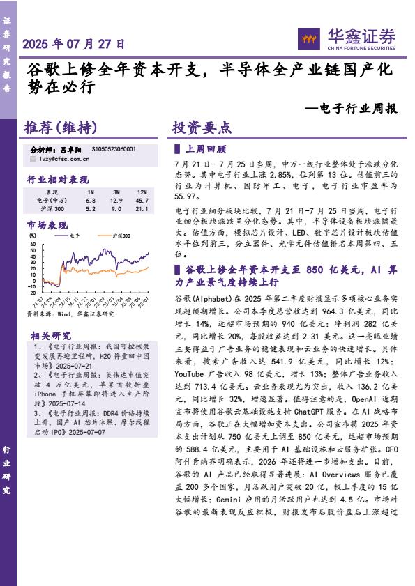 【18561】【华鑫证券】电子行业周报:谷歌上修全年资本开支,半导体全产业链国产化势在必行 1天前 7月 1 预览结束,本文件为PDF文档,一共35页,请购买后,下载查看 资源下载下载价格59 H币VIP免费升级VIP立即购买下载或充值问题请将订单号发送到:2907878669@qq.com ,我们会在24小时内为您处理 科技电子