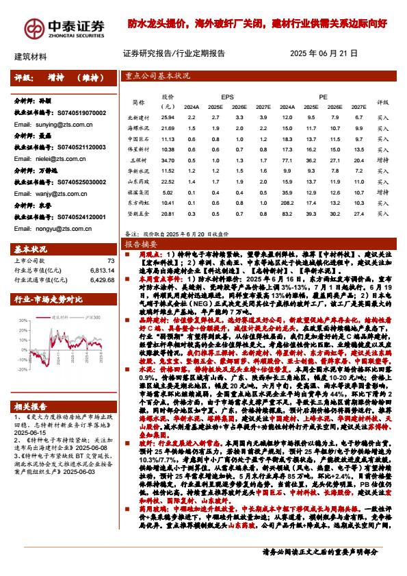 【18352】【中泰证券】建筑材料行业:防水龙头提价,海外玻纤厂关闭,建材行业供需关系边际向好 12小时前 7月 1 预览结束,本文件为PDF文档,一共19页,请购买后,下载查看 资源下载下载价格59 H币VIP免费升级VIP立即购买下载或充值问题请将订单号发送到:2907878669@qq.com ,我们会在24小时内为您处理 地产开发