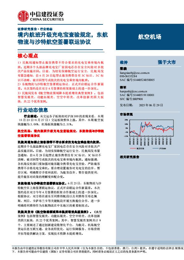 【18296】【中信建投】航空机场行业动态:境内航班升级充电宝查验规定,东航物流与沙特航空签署联运协议 1天前 7月 1 预览结束,本文件为PDF文档,一共20页,请购买后,下载查看 资源下载下载价格59 H币VIP免费升级VIP立即购买下载或充值问题请将订单号发送到:2907878669@qq.com ,我们会在24小时内为您处理 汽车物流