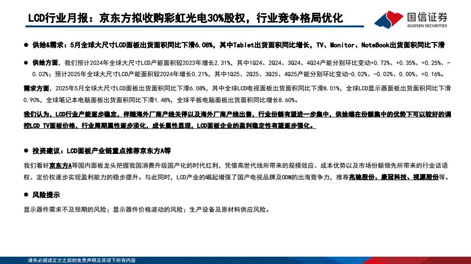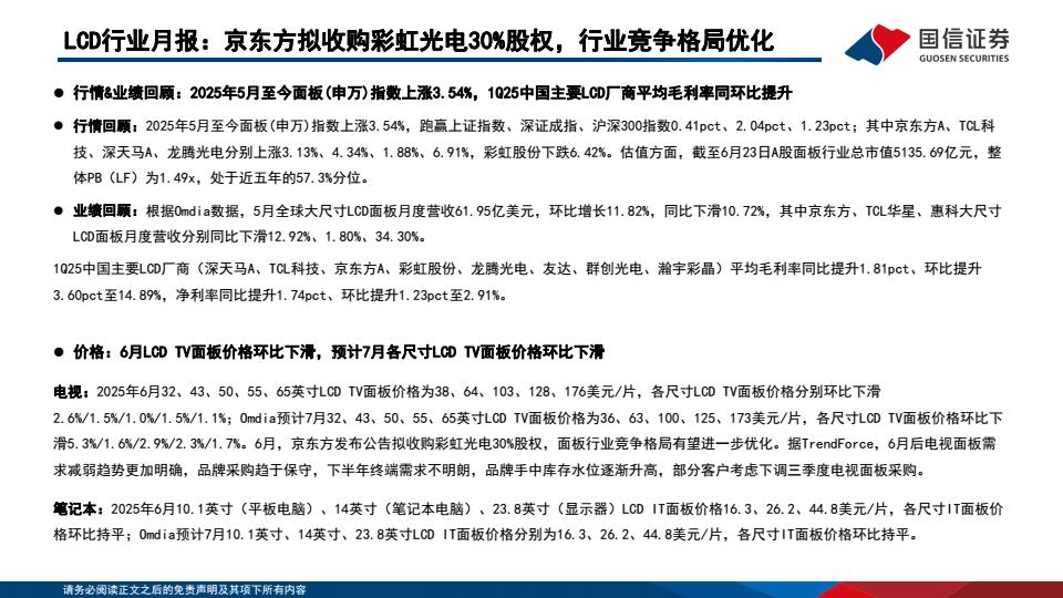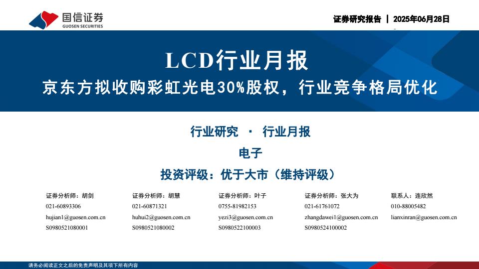 【18687】【国信证券】LCD行业月报:京东方拟收购彩虹光电30%股权,行业竞争格局优化 17小时前 7月 1 预览结束,本文件为PDF文档,一共22页,请购买后,下载查看 资源下载下载价格59 H币VIP免费升级VIP立即购买下载或充值问题请将订单号发送到:2907878669@qq.com ,我们会在24小时内为您处理 金融分析
