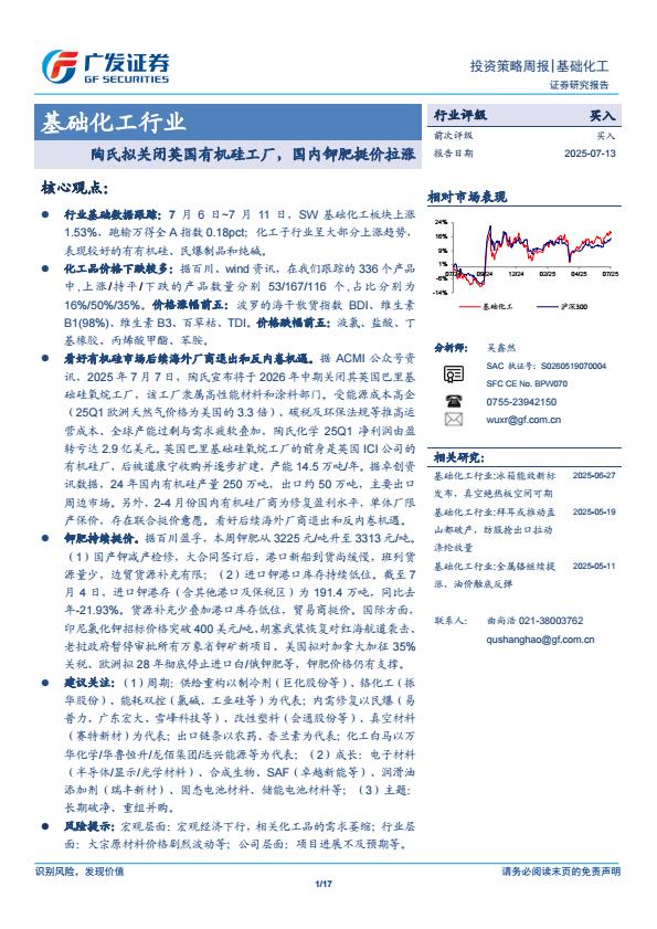 【18789】【广发证券】基础化工行业:陶氏拟关闭英国有机硅工厂,国内钾肥挺价拉涨 1天前 7月 1 预览结束,本文件为PDF文档,一共17页,请购买后,下载查看 资源下载下载价格59 H币VIP免费升级VIP立即购买下载或充值问题请将订单号发送到:2907878669@qq.com ,我们会在24小时内为您处理 能源化工
