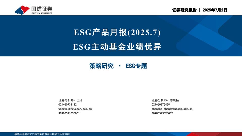 【18694】【国信证券】ESG产品月报(2025.7):ESG主动基金业绩优异 17小时前 7月 1 预览结束,本文件为PDF文档,一共24页,请购买后,下载查看 资源下载下载价格59 H币VIP免费升级VIP立即购买下载或充值问题请将订单号发送到:2907878669@qq.com ,我们会在24小时内为您处理 银行金融