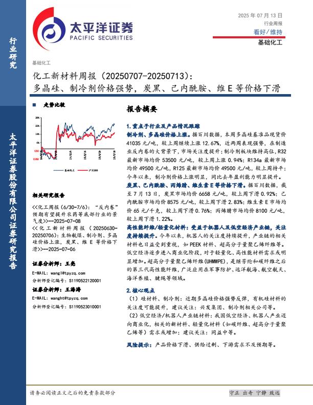 【18470】【太平洋证券】化工新材料周报:多晶硅、制冷剂价格强势,炭黑、己内酰胺、维E等价格下滑 1天前 7月 1 预览结束,本文件为PDF文档,一共22页,请购买后,下载查看 资源下载下载价格59 H币VIP免费升级VIP立即购买下载或充值问题请将订单号发送到:2907878669@qq.com ,我们会在24小时内为您处理 能源化工