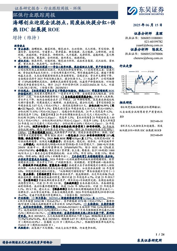 【18832】【东吴证券】环保行业跟踪周报:海螺创业迎现金流拐点,固废板块提分红+供热IDC拓展提ROE 1天前 7月 2 预览结束,本文件为PDF文档,一共24页,请购买后,下载查看 资源下载下载价格59 H币VIP免费升级VIP立即购买下载或充值问题请将订单号发送到:2907878669@qq.com ,我们会在24小时内为您处理 能源化工