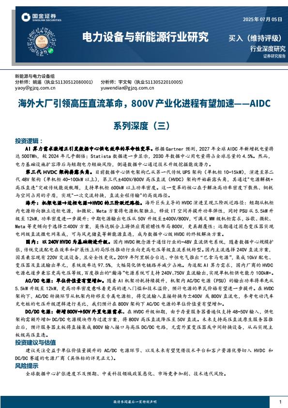 【18764】【国金证券】电力设备与新能源行业AIDC系列深度(三):海外大厂引领高压直流革命,800V产业化进程有望加速 2天前 7月 2 预览结束,本文件为PDF文档,一共20页,请购买后,下载查看 资源下载下载价格59 H币VIP免费升级VIP立即购买下载或充值问题请将订单号发送到:2907878669@qq.com ,我们会在24小时内为您处理 科技电子