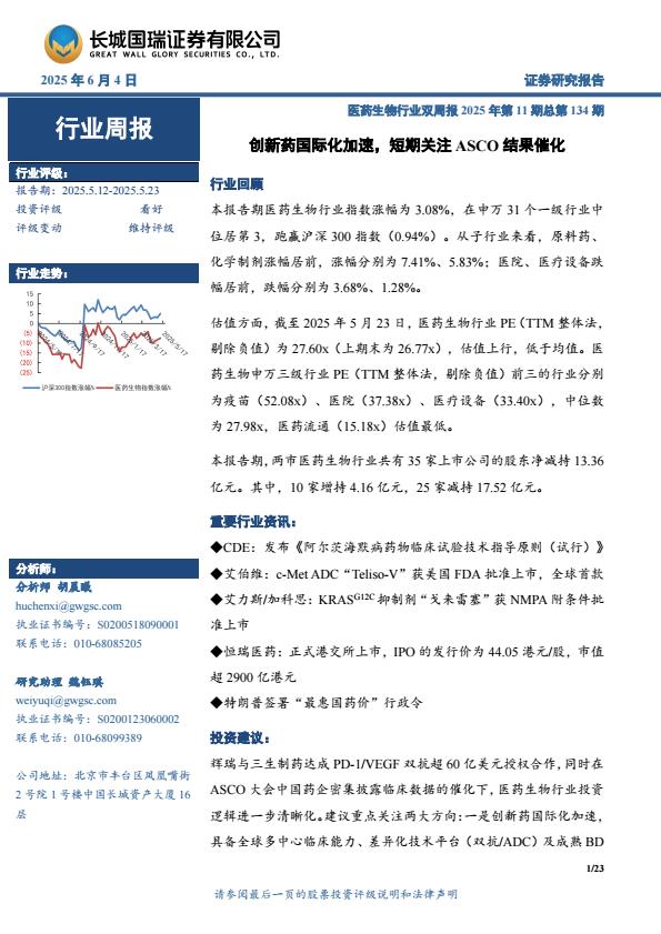 【18412】【长城国瑞证券】医药生物行业周报:医药生物行业双周报2025年第11期总第134期创新药国际化加速,短期关注ASCO结果催化 1天前 7月 1 预览结束,本文件为PDF文档,一共23页,请购买后,下载查看 资源下载下载价格59 H币VIP免费升级VIP立即购买下载或充值问题请将订单号发送到:2907878669@qq.com ,我们会在24小时内为您处理 医疗保健
