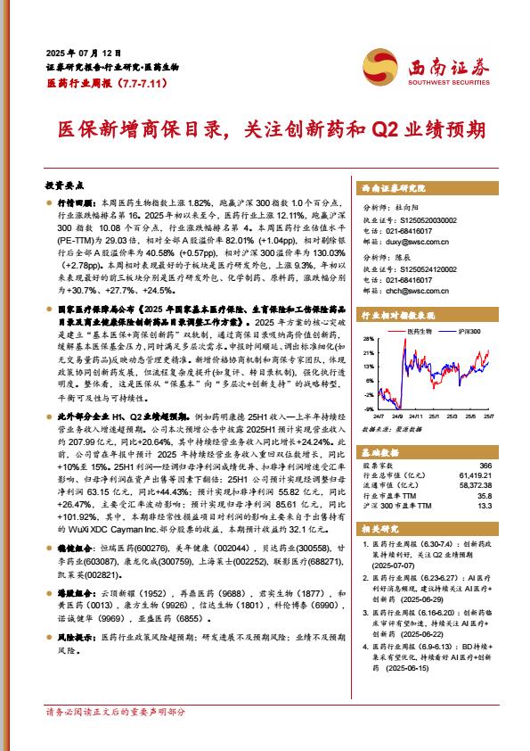 【18431】【西南证券】医保新增商保目录,关注创新药和Q2业绩预期 17小时前 7月 1 预览结束,本文件为PDF文档,一共30页,请购买后,下载查看 资源下载下载价格59 H币VIP免费升级VIP立即购买下载或充值问题请将订单号发送到:2907878669@qq.com ,我们会在24小时内为您处理 医疗保健