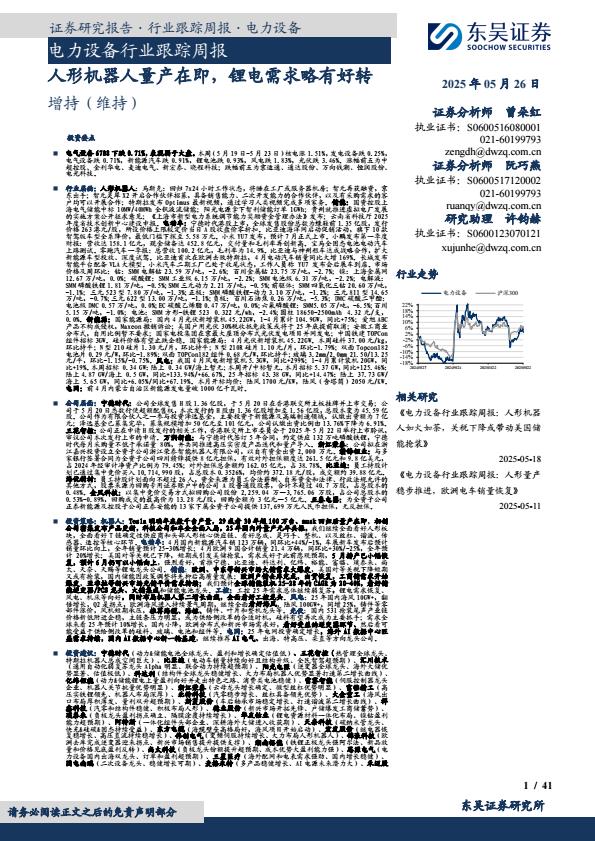 【18847】【东吴证券】电力设备行业跟踪周报:人形机器人量产在即,锂电需求略有好转 1天前 7月 3 预览结束,本文件为PDF文档,一共41页,请购买后,下载查看 资源下载下载价格59 H币VIP免费升级VIP立即购买下载或充值问题请将订单号发送到:2907878669@qq.com ,我们会在24小时内为您处理 科技电子