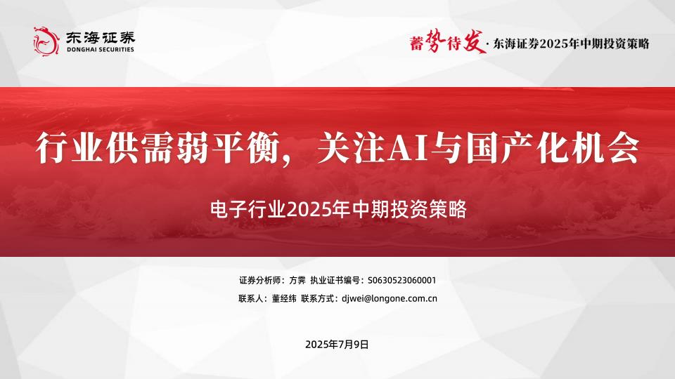【18864】【东海证券】电子行业2025年中期投资策略:行业供需弱平衡,关注AI与国产化机会 1天前 7月 1 预览结束,本文件为PDF文档,一共42页,请购买后,下载查看 资源下载下载价格59 H币VIP免费升级VIP立即购买下载或充值问题请将订单号发送到:2907878669@qq.com ,我们会在24小时内为您处理 科技电子