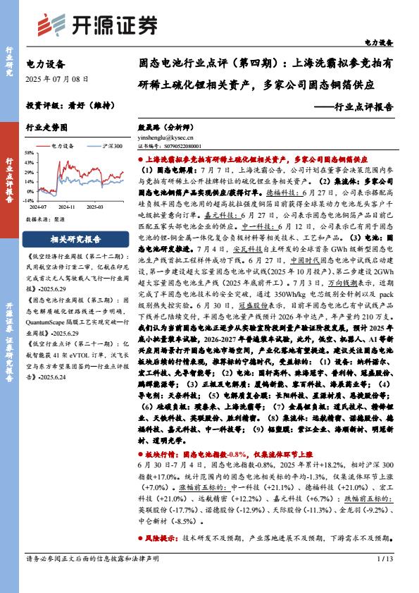 【18532】【开源证券】固态电池行业点评(第四期):上海洗霸拟参竞拍有研稀土硫化锂相关资产,多家公司固态铜箔供应 16小时前 7月 1 预览结束,本文件为PDF文档,一共13页,请购买后,下载查看 资源下载下载价格59 H币VIP免费升级VIP立即购买下载或充值问题请将订单号发送到:2907878669@qq.com ,我们会在24小时内为您处理 能源化工