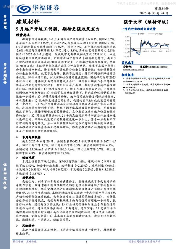 【18614】【华福证券】建筑材料行业定期报告:5月地产开竣工仍弱,期待更强政策发力 8小时前 7月 1 预览结束,本文件为PDF文档,一共11页,请购买后,下载查看 资源下载下载价格59 H币VIP免费升级VIP立即购买下载或充值问题请将订单号发送到:2907878669@qq.com ,我们会在24小时内为您处理 地产开发