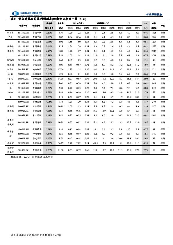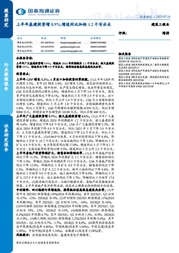 【18707】【国泰海通证券】建筑工程行业跟踪报告:上半年基建投资增8.9%,增速同比加快1.2个百分点 8小时前 7月 1 预览结束,本文件为PDF文档,一共20页,请购买后,下载查看 资源下载下载价格59 H币VIP免费升级VIP立即购买下载或充值问题请将订单号发送到:2907878669@qq.com ,我们会在24小时内为您处理 地产开发