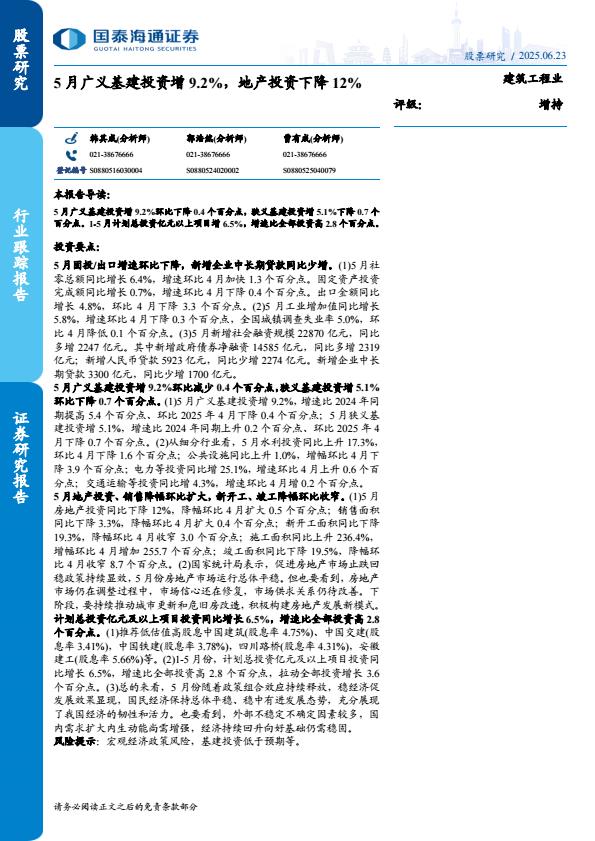 【18708】【国泰海通证券】建筑工程行业:5月广义基建投资增9.2 8小时前 7月 1 预览结束,本文件为PDF文档,一共19页,请购买后,下载查看 资源下载下载价格59 H币VIP免费升级VIP立即购买下载或充值问题请将订单号发送到:2907878669@qq.com ,我们会在24小时内为您处理 地产开发