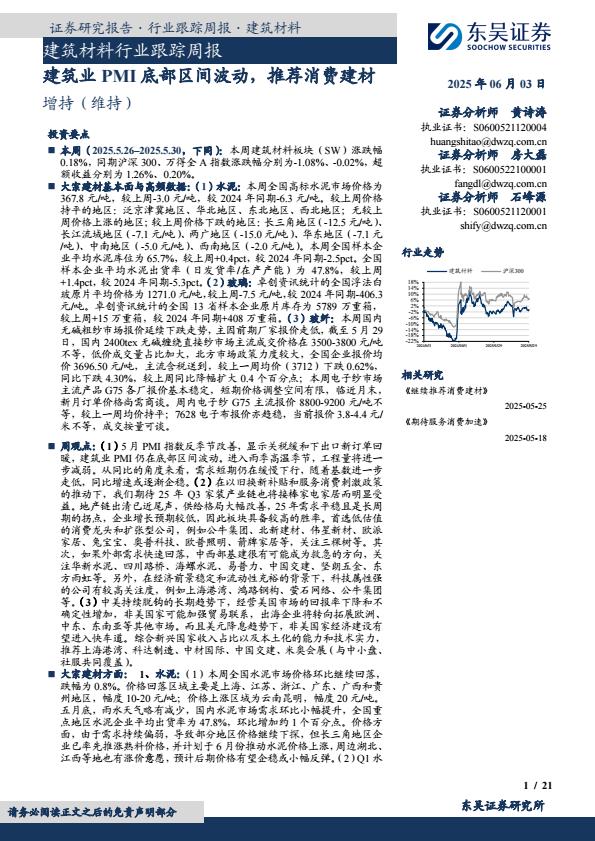 【18827】【东吴证券】建筑材料行业跟踪周报:建筑业PMI底部区间波动,推荐消费建材 16小时前 7月 1 预览结束,本文件为PDF文档,一共21页,请购买后,下载查看 资源下载下载价格59 H币VIP免费升级VIP立即购买下载或充值问题请将订单号发送到:2907878669@qq.com ,我们会在24小时内为您处理 地产开发