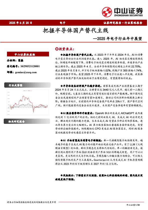 【18364】【中山证券】2025年电子行业年中展望:把握半导体国产替代主线 12小时前 7月 1 预览结束,本文件为PDF文档,一共28页,请购买后,下载查看 资源下载下载价格59 H币VIP免费升级VIP立即购买下载或充值问题请将订单号发送到:2907878669@qq.com ,我们会在24小时内为您处理 科技电子