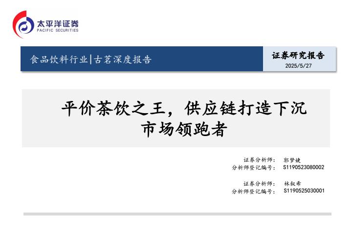 【18464】【太平洋证券】平价茶饮之王,供应链打造下沉市场领跑者 8小时前 7月 2 预览结束,本文件为PDF文档,一共48页,请购买后,下载查看 资源下载下载价格59 H币VIP免费升级VIP立即购买下载或充值问题请将订单号发送到:2907878669@qq.com ,我们会在24小时内为您处理 消费零售