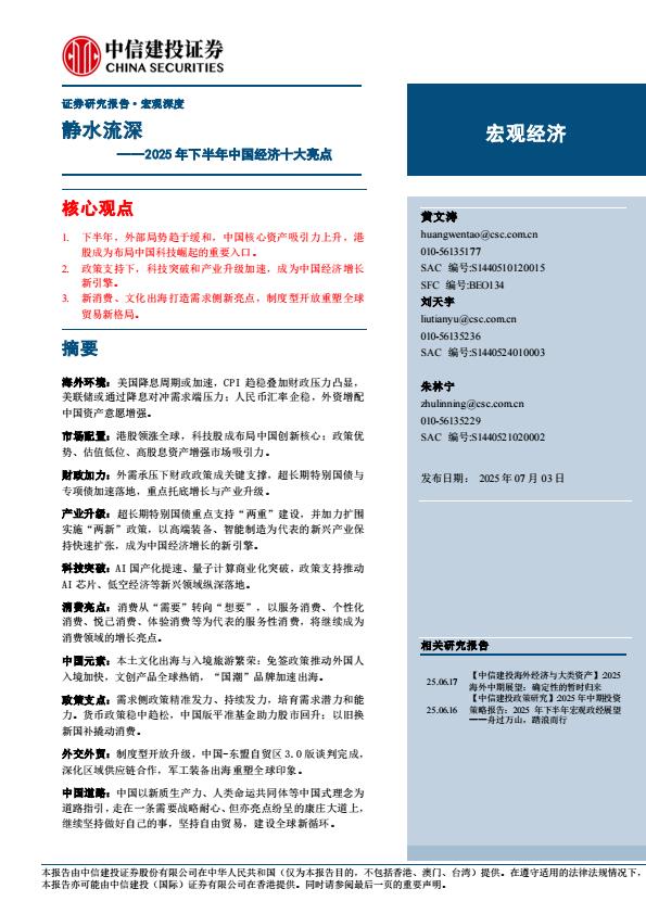【18344】【中信建投】2025年下半年中国经济十大亮点:静水流深 15小时前 7月 1 预览结束,本文件为PDF文档,一共23页,请购买后,下载查看 资源下载下载价格59 H币VIP免费升级VIP立即购买下载或充值问题请将订单号发送到:2907878669@qq.com ,我们会在24小时内为您处理 金融分析